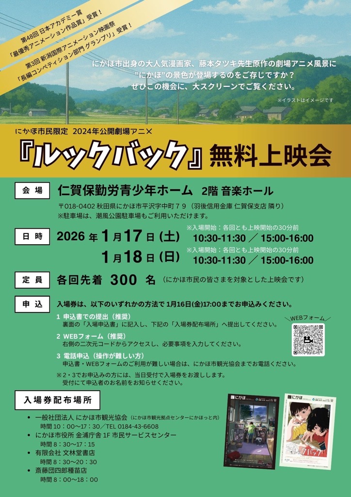 この度、にかほ市出身の漫画家・藤本タツキ氏の原作「ルックバック」をアニメ化した、劇場アニメ「ルックバック」の無料上映会をにかほ市民の皆様向け【要申込】に開催します。たくさんのご来場お待ちしております。