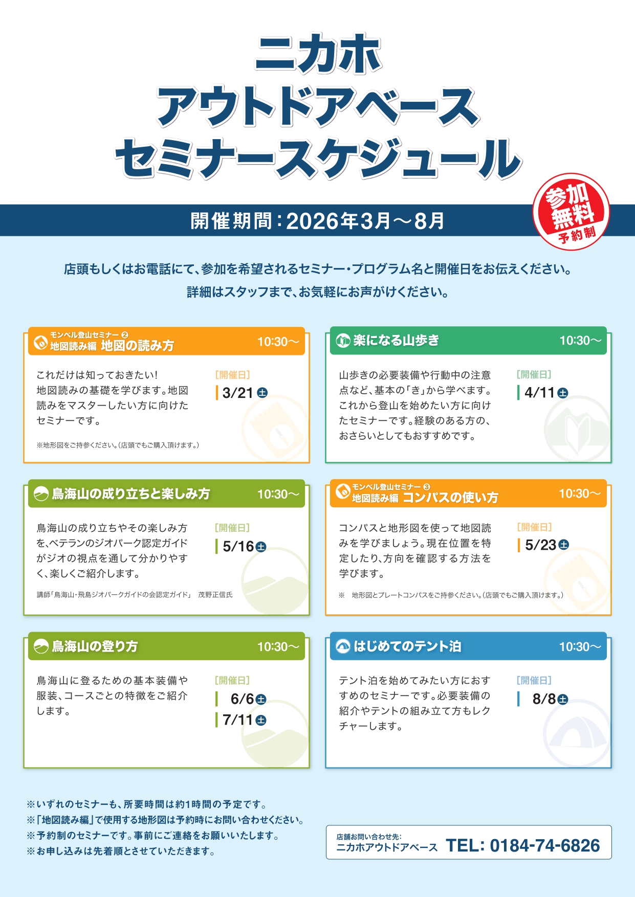 【申込み・問合せ先】ニカホアウトドアベース(モンベルにかほ店) 電話番号0184-74-6826